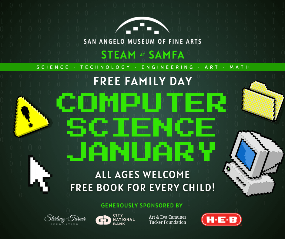 The San Angelo Museum of Fine Arts is accredited by the American Alliance of Museums. Free Family Day is generously sponsored by the Art and Eva Tucker Foundation, City National Bank, H-E-B Tournament of Champions Charitable Trust, Sterling Turner Foundation.