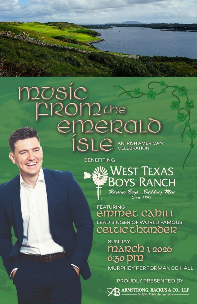 Take a journey across the Atlantic and experience a night of the most incredible Irish songs and stories. Emmet Cahill, an acclaimed tenor from Mullingar, Ireland and principal lead singer with the world-renowned, Irish music group, Celtic Thunder, is bringing to San Angelo the beautiful sounds of the Emerald Isle as a friend and supporter of the West Texas Boys Ranch.